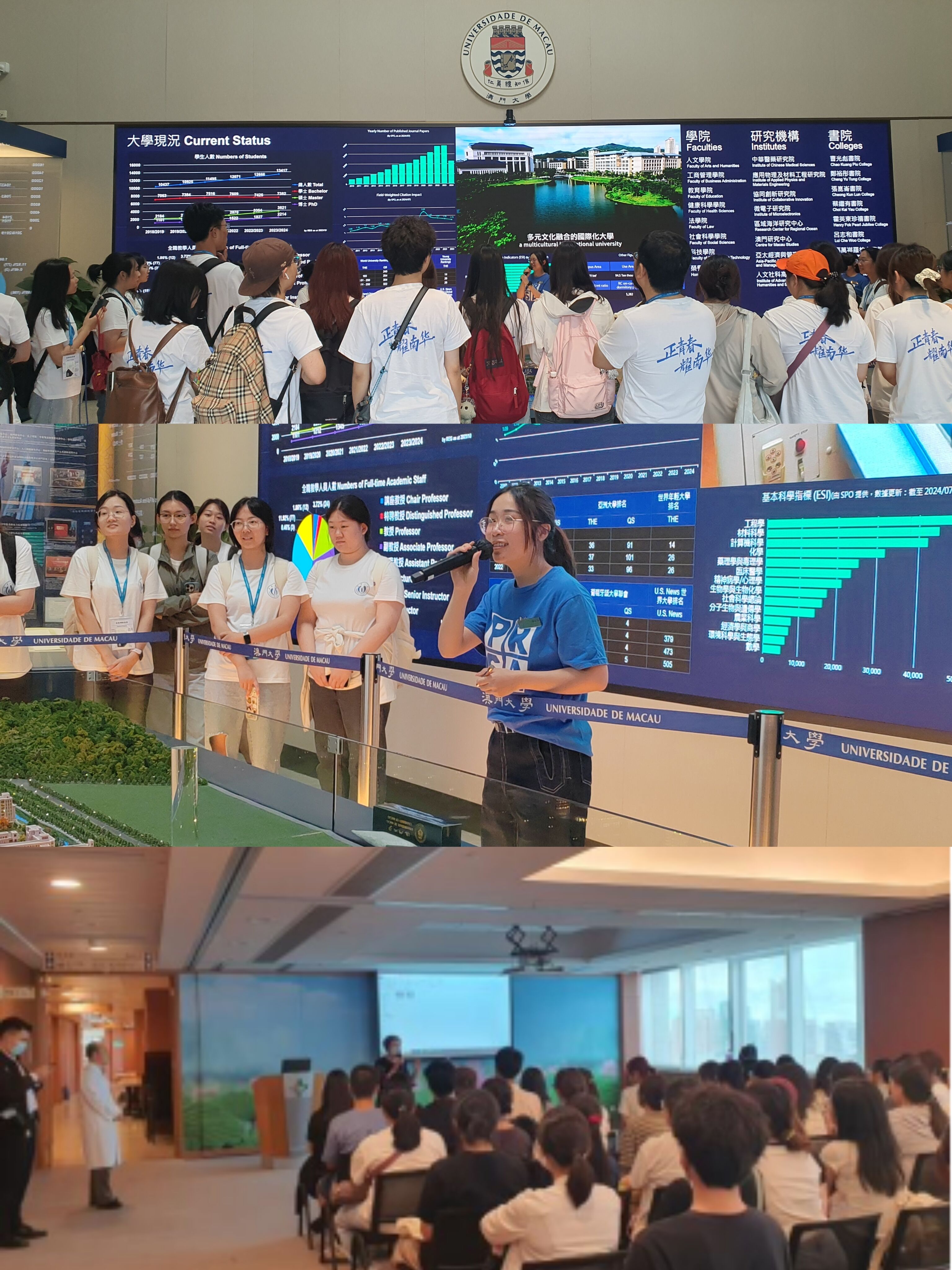 研学团跟随澳门大学志愿者参观校园以及澳门地区最大的私立医院--镜湖医院。实地考察活动让员工们近距离感受到了科研的魅力和医疗技术的进步,加深了对医药与健康科学的理解和认识。