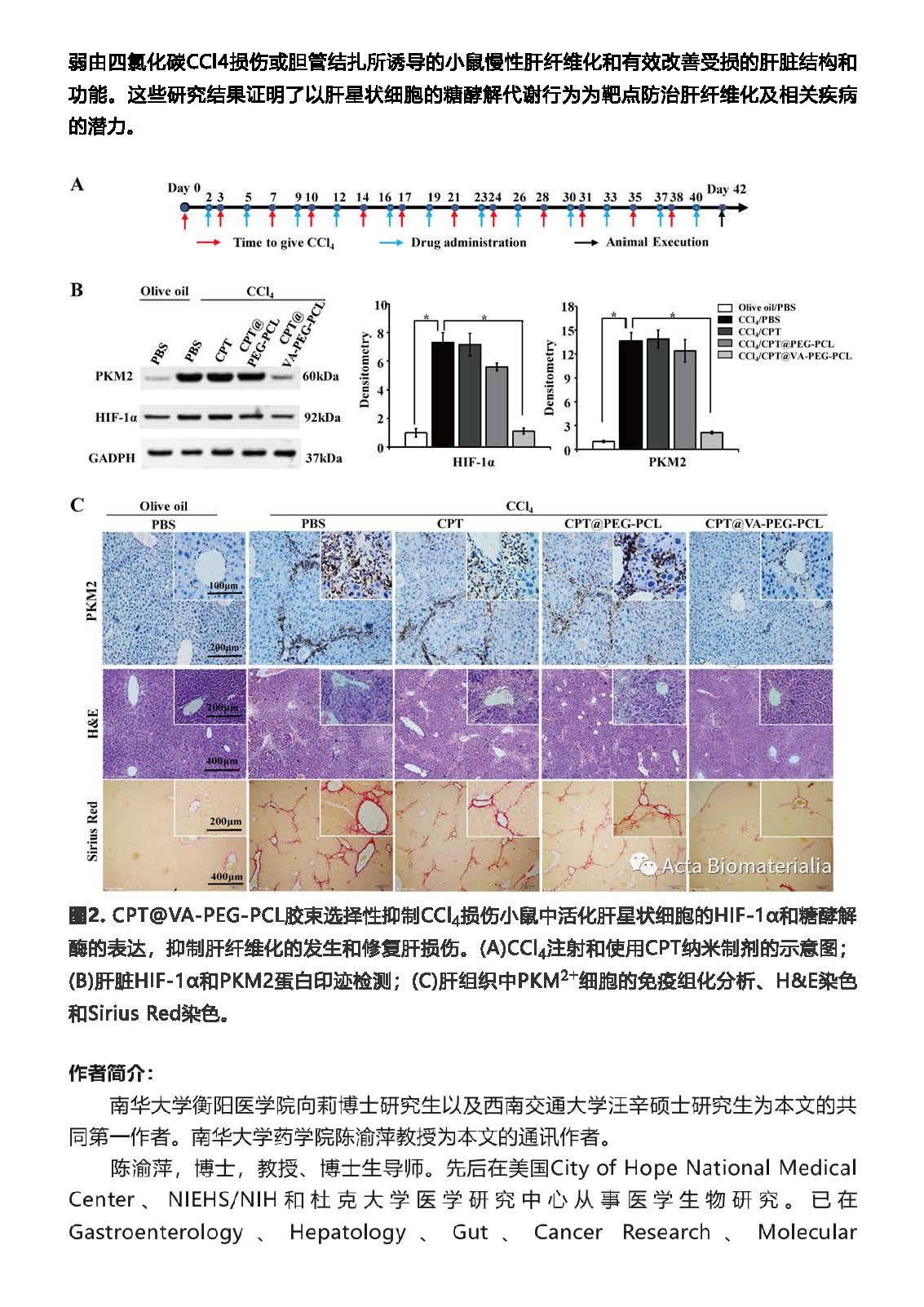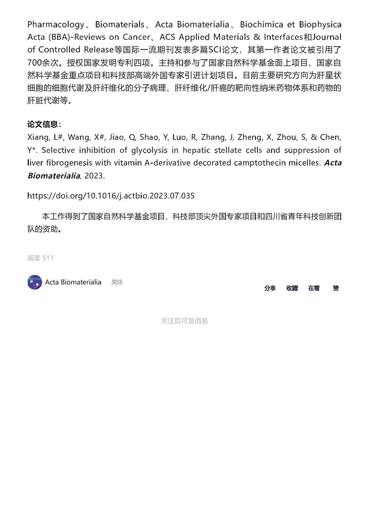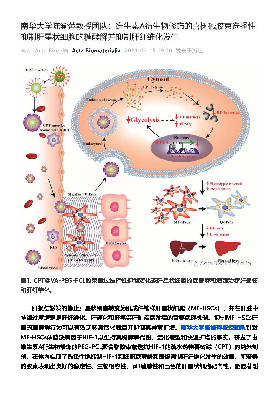 beats365vip官网登录入口高层次人才陈渝萍教授所带领的团队在Acta Biomaterialia期刊发表“维生素A衍生物修饰的喜树碱胶束选择性抑制肝星状细胞的糖酵解并抑制肝纤维化发生”学术论文。