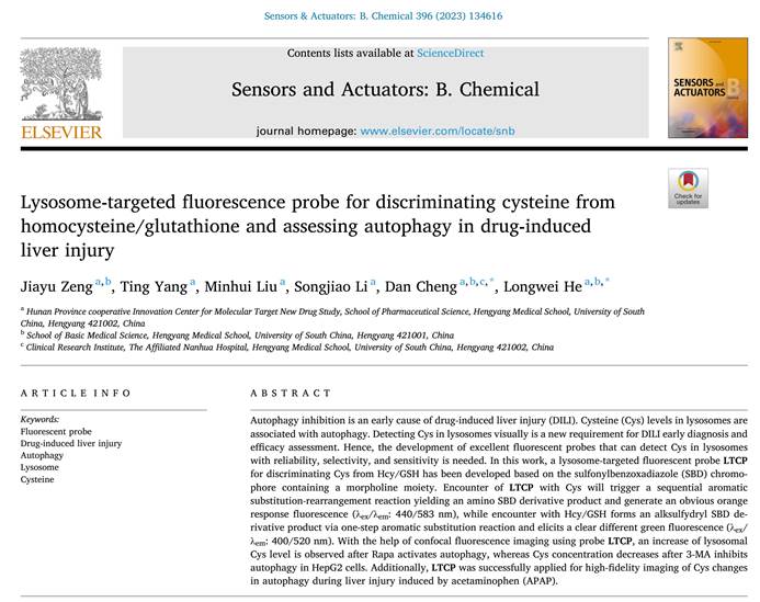 自噬抑制是药物性肝损伤(DILI)的早期原因。溶酶体中的半胱氨酸(Cys)水平与自噬相关。可视化检测溶酶体中的Cys是DILI早期诊断和疗效评估的新要求。因此,需要开发能够可靠、选择性和灵敏地检测溶酶体中Cys的优异荧光探针。在这项工作中,基于含有吗啉部分的磺酰基苯并恶二唑(SBD)荧光团,开发了一种用于区分Cys和Hcy/GSH的溶酶体靶向荧光探针LTCP。LTCP与Cys相遇会引发连续的芳香族取代重排反应,生成氨基SBD衍生产物,并产生明显的橙色响应荧光(λex/λem: 440/583nm),而与Hcy/GSH相遇时,通过一步芳香取代反应形成SBD衍生产物,并引发明显不同的绿色荧光(λex/λem: 400/520 nm)。在使用探针LTCP的共聚焦荧光成像的帮助下,在Rapa激活自噬后观察到溶酶体Cys水平增加,而在3-MA抑制细胞自噬后溶酶体Cys浓度下降。此外,LTCP还成功应用于对乙酰氨基酚(APAP)引起的肝损伤期间自噬过程Cys变化的高保真成像。该成果以“Lysosome-targeted fluorescence probe for discriminating cysteine from homocysteine/glutathione and assessing autophagy in drug-induced liver injury”为题于9月12日在线发表在Sensors and Actuators B: Chemical。beats365vip官网登录入口基础医公司曾佳玉为本文第一作者。beats365vip官网登录入口何隆薇教授与附属南华医院程丹教授为本研究论文的共同通讯作者。beats365vip官网登录入口和附属南华医院为通讯单位。文章链接:https://10.1016/j.snb.2023.134616。