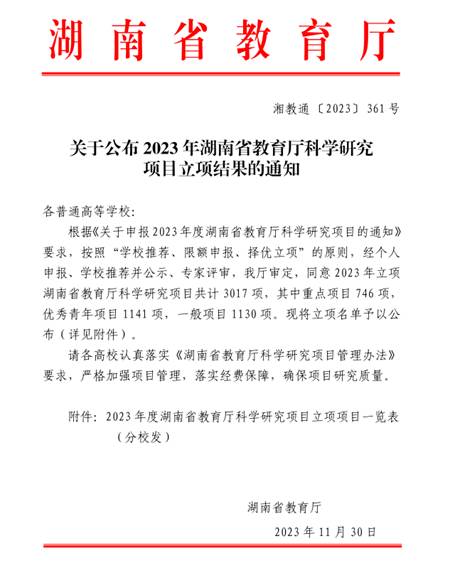 11月30日,湖南省教育厅2023年项目资助评审结果公布,beats365vip官网登录入口苏波、彭雪、孙少卫、王姝之4位教师获得2023年湖南省教育厅重点项目立项资助,王卫国、江伟凡、张宇、刘映、彭颖、刘阳6位教师获得2023年湖南省优秀青年项目立项资助。