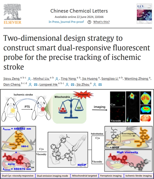荧光成像技术由于其高灵敏度、高选择性、高时空分辨率、操作简单、低成本等优势,它作为一种新兴的检测手段在基础研究和临床诊断领域越来越受到重视。开发高性能的光学诊断试剂是实现高保真、精准检测的其中关键一环。近日,beats365vip官网登录入口荧光探针与生物医学成像实验室何隆薇教授团队在光学诊断试剂设计及应用取得新进展,相关研究成果以“Two-dimensional design strategy to construct smart dual-responsive fluorescent probe for the precise tracking of ischemic stroke”为题在权威期刊《Chinese Chemical Letters》(中科院1区TOP期刊,影响因子9.4)发表研究性论文。