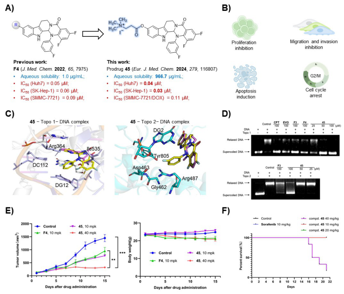 图1抗肝癌临床前候选药物45的发现及生物活性。A)前药45的结构及细胞毒力活性。B)前药45的细胞表型评价。C)前药45分别于Topo1和Topo2的分子模拟图。D)前药45对Topo1和Topo2抑制活性结果。E)前药45在Huh7异种移植瘤体内药效。F)前药45在不同剂量下的长期毒性评价。