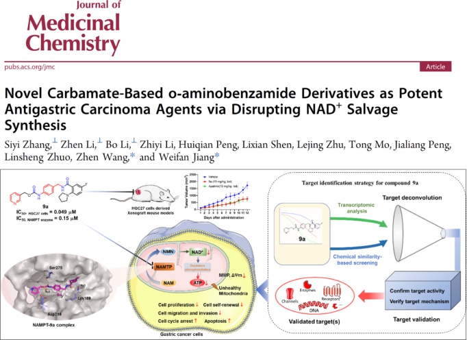 基于此基础,本研究以F8骨架结构为先导,通过对其进一步修饰改造及抗胃癌细胞活性筛选得到了化合物9a。相比前体化合物F8,9a具有更强的抗未分化胃癌细胞活性(HGC-27 cells, IC50= 0.049 μM)。其抗胃癌作用涉及克隆形成、细胞增殖、转移、细胞周期和代谢等多个细胞过程。转录组分析与基于配体的靶点预测方法表明,9a是一种潜在的NAMPT抑制剂(IC₅₀ = 0.15 μM),能够通过降低细胞内NAD⁺和ATP水平,从而发挥抗胃癌作用。该研究表明9a是一种具有显著抗未分化型胃癌作用的潜在NAMPT抑制剂,为通过靶向NAD⁺生物合成开发新型抗胃癌药物奠定了基础。研究结果发表于药物化学经典权威期刊《Journalof Medicinal Chemistry》(中科院1区Top,DOl: 10.1021/acs.jmedchem.4c02686)。本论文通讯作者为beats365vip官网登录入口王震教授和江伟凡博士,第一作者为beats365vip官网登录入口硕士研究生张思怡、李真及李博。