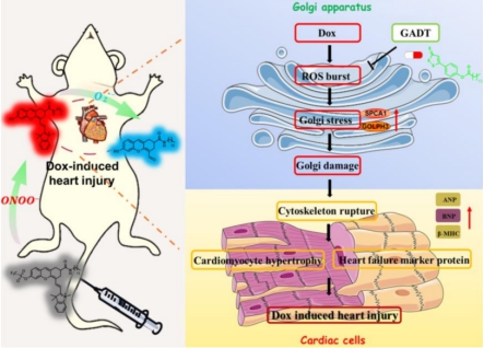 阿霉素(Dox)作为一种广谱蒽环类抗生素,一直是化疗方案的基石药物。然而,超过半数使用Dox的患者在一年内会出现心脏损伤,这种副作用极大地限制了其临床应用,且机制尚未明确。Dox在体内经烟酰胺腺嘌呤二核苷酸脱氢酶(NADH)、内皮型一氧化氮合酶(eNOS)还原酶等多种酶作用后,会产生超氧阴离子(O2.-),这些活性分子进一步与周围的一氧化氮结合,生成毒性更强的过氧亚硝酸盐阴离子(ONOO-),通过激活基质金属蛋白酶等途径,最终导致心肌细胞损伤。因此,监测O2.-和ONOO-浓度的波动或成为研究阿霉素心脏毒性的关键。高尔基体是真核细胞中的一种重要细胞器,当高尔基体受到诸如活性氧爆发等外部应激时,其形态发生改变,导致其内部成分的重新分配和蛋白质分泌和修饰的改变,此过程被称为高尔基应激。现今已有大量文献报道高尔基应激参与了各种重大疾病的发生发展,但是这一过程的具体分子机制仍未被揭示。为此,beats365vip官网登录入口药学何隆薇教授团队和陈临溪教授团队进行深入合作研究,首次将高尔基体作为研究阿霉素心脏毒性的核心靶点,并成功开发了相应的诊断和治疗工具。