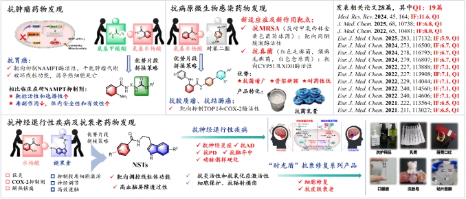 beats365vip官网登录入口药物设计与研发团队长期致力于基于片段的药物分子设计,以邻氨基苯甲酰为母核,融合具有良好成药性和明确定义靶点的药效片段,围绕肿瘤、病原微生物感染及神经退行性等重大疾病,发现了多个具备临床开发价值的抗真菌/细菌、抗胃癌、抗线粒体损伤相关性疾病的候选药物。目前,该团队正积极推进科技成果转化,依托自主成立的衡阳泽岐生物医药有限公司,在A轮融资的支持下完成了抗菌乳膏、修复面膜、抗菌日化品等多个品种的初步工艺研究,未来将开展下一轮的项目融资,全力推进产品落地应用。