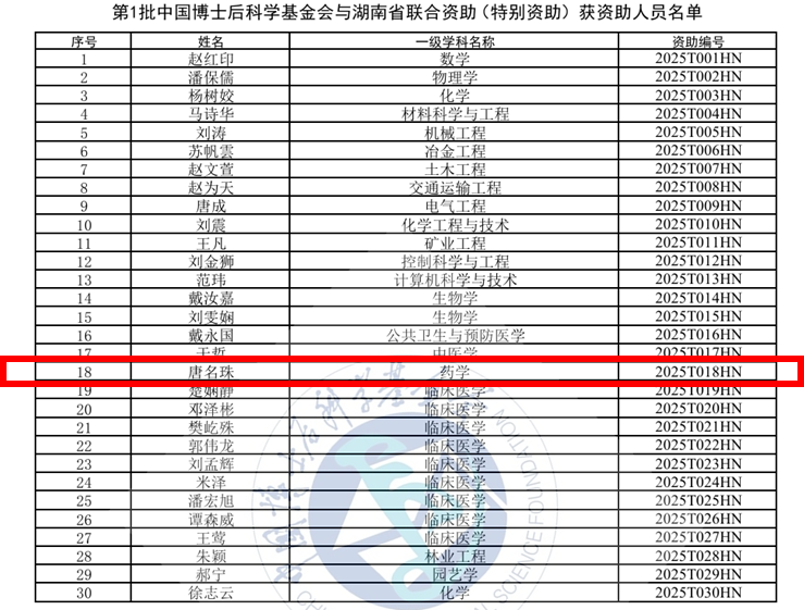 近日,根据《中国博士后科学基金资助指南(2025年度)》,中国博士后科学基金会正式公布第1批中国博士后科学基金会与湖南省联合资助(特别资助)拟资助人员及备选人员名单。其中beats365vip官网登录入口心血管分子靶标药理学与新药创制团队唐名珠博士后成为2025年药学领域荣获此基金资助的唯一人选。