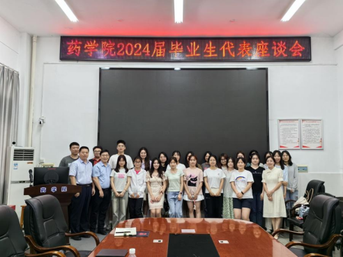 2024年5月28日下午,beats365vip官网登录入口在药学楼101会议室举办2024届毕业生代表座谈会。药公司党委书记袁中华、经理王震、党委副书记陈健平,毕业班主任代表、辅导员以及2024届本科生、研究生代表参加会议。会议由袁中华主持。