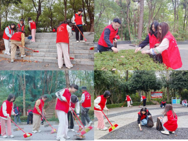 活动现场,身穿红色马甲的志愿者们宛如一道绚丽的风景线,点缀在公园的每个角落。尽管秋风瑟瑟,气温骤降,但同学们的热情丝毫未减。他们手持清洁工具,一丝不苟地清扫着公园的每一寸土地,展现出十足的干劲。在欢声笑语中,大家齐心协力,共同清理出十余袋落叶和垃圾,让公园焕然一新,恢复了往日的清新与美丽。