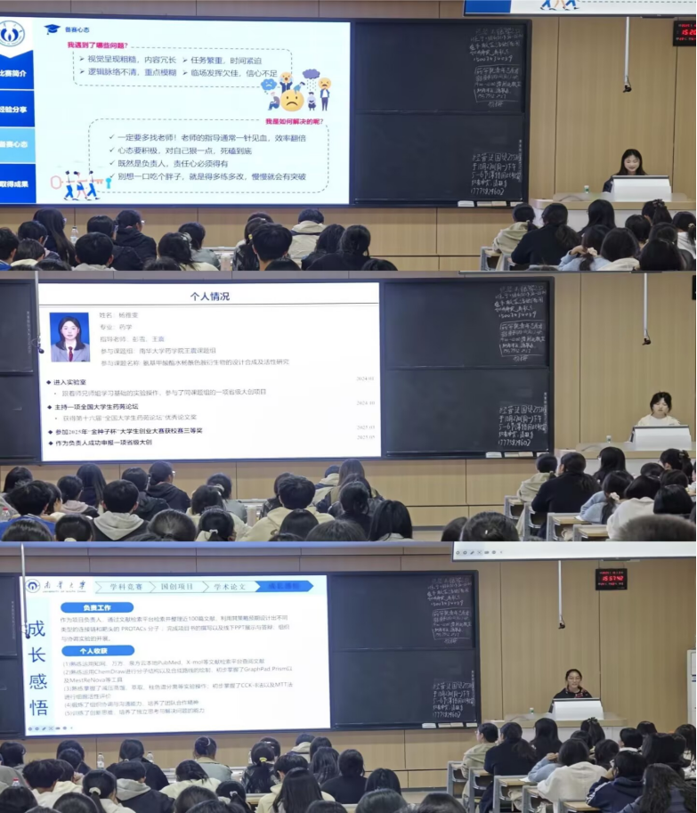 随后,参与国家级大创项目的优秀员工团队依次登台,进行项目成果汇报与经验分享。曾羡麟、杨雅雯、赵泽艳、舒晴四位同学分别通过PPT演示与现场讲解相结合的方式,系统介绍了项目的研究背景、创新亮点、实施过程及取得成果。展示项目覆盖药物研发、药剂学、药物分析、药理学等多个药学细分领域,彰显了beats365vip官网登录入口学子扎实的专业功底、蓬勃的创新活力与出色的实践能力。他们同步分享了项目攻坚经验,为低年级员工提供可复制的双创路径。