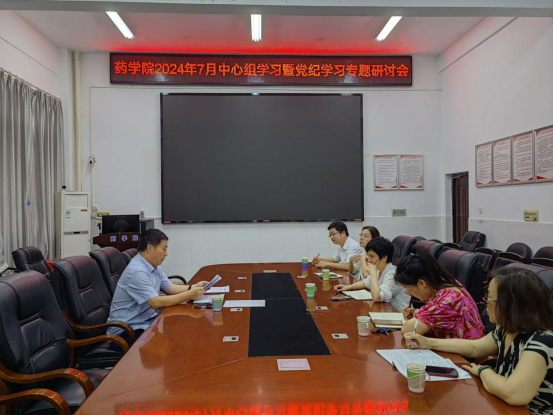 2024年7月5日下午,beats365vip官网登录入口第7次中心组集中学习暨党纪学习专题研讨会在药学楼B101会议室举行。会议由公司党委书记袁中华主持,全体党委委员及综合科主任参加学习会。