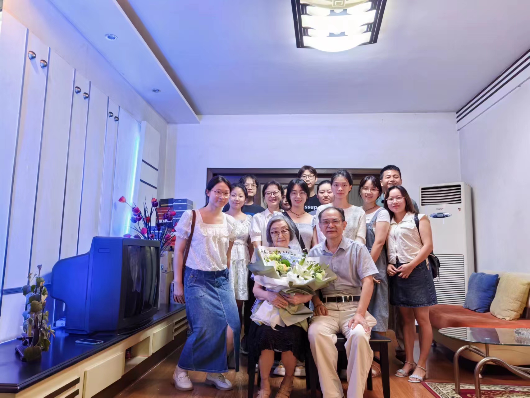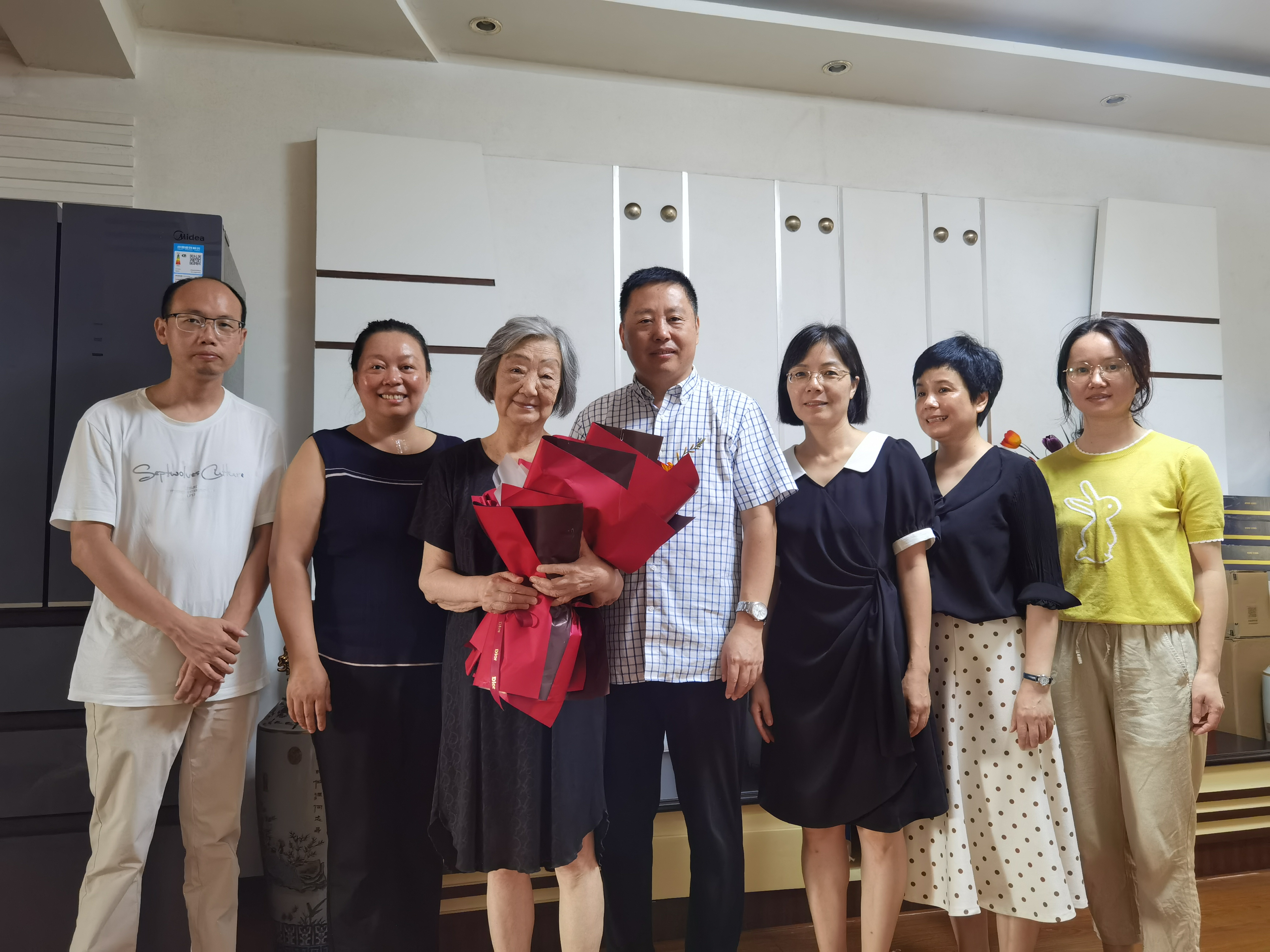 袁中华代表公司送上了献花和节日的祝福,感谢余麟老师为公司和公司事业发展所作出的贡献。祝愿余麟老师保重身体,关心关注公司发展。最后,大家与余麟老师合影留念。