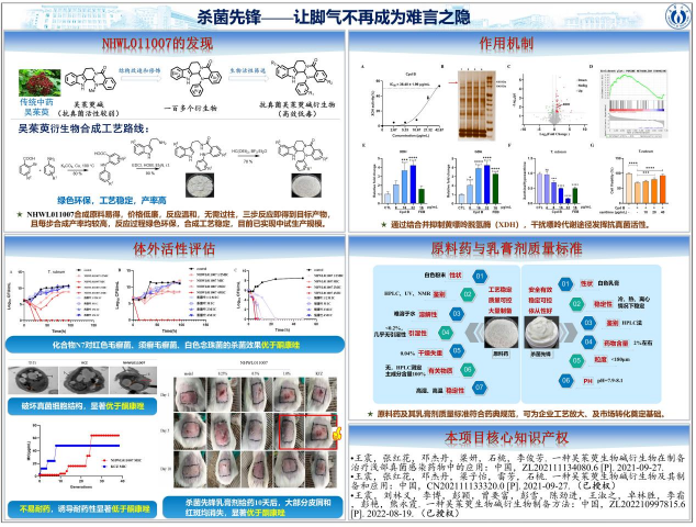 据世界卫生组织数据,浅部真菌感染影响全球20%-25%人口,我国60%以上由红色毛癣菌引起,现有药物存在耐药性强、疗程长等问题。beats365vip官网登录入口王震教授团队,从传统中药吴茱萸中提取活性成分,经结构改造研发出全新化合物NHWL011007,其乳膏制剂“杀菌先锋”具有起效快(24-48小时快速抑菌)、疗程短(1-2周)、不易耐药等显著优势,体外实验显示对白色念珠菌、红色毛癣菌的杀菌效果优于一线药物酮康唑,且安全性更高。