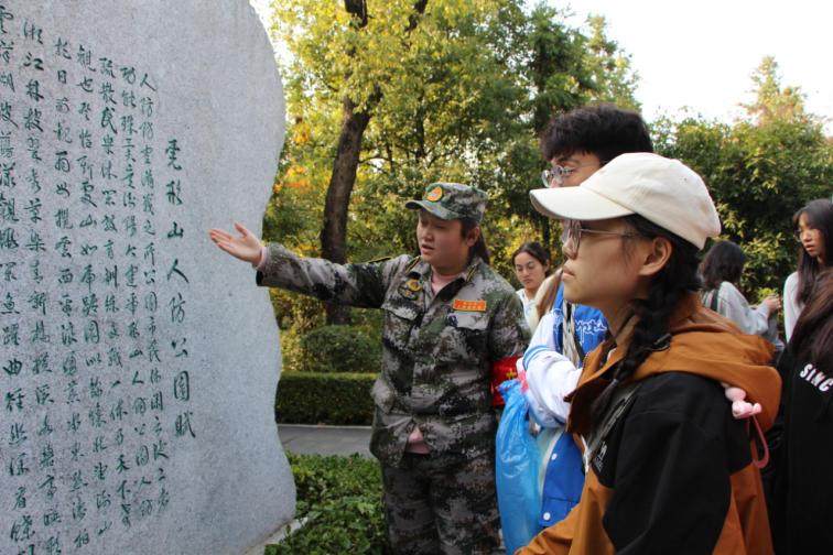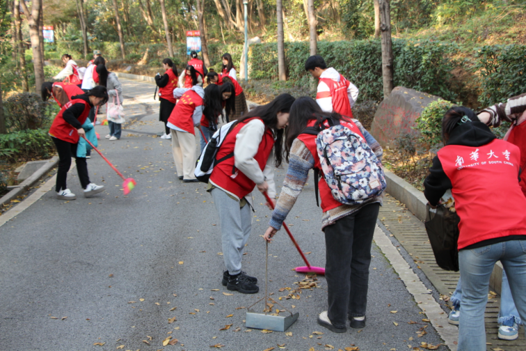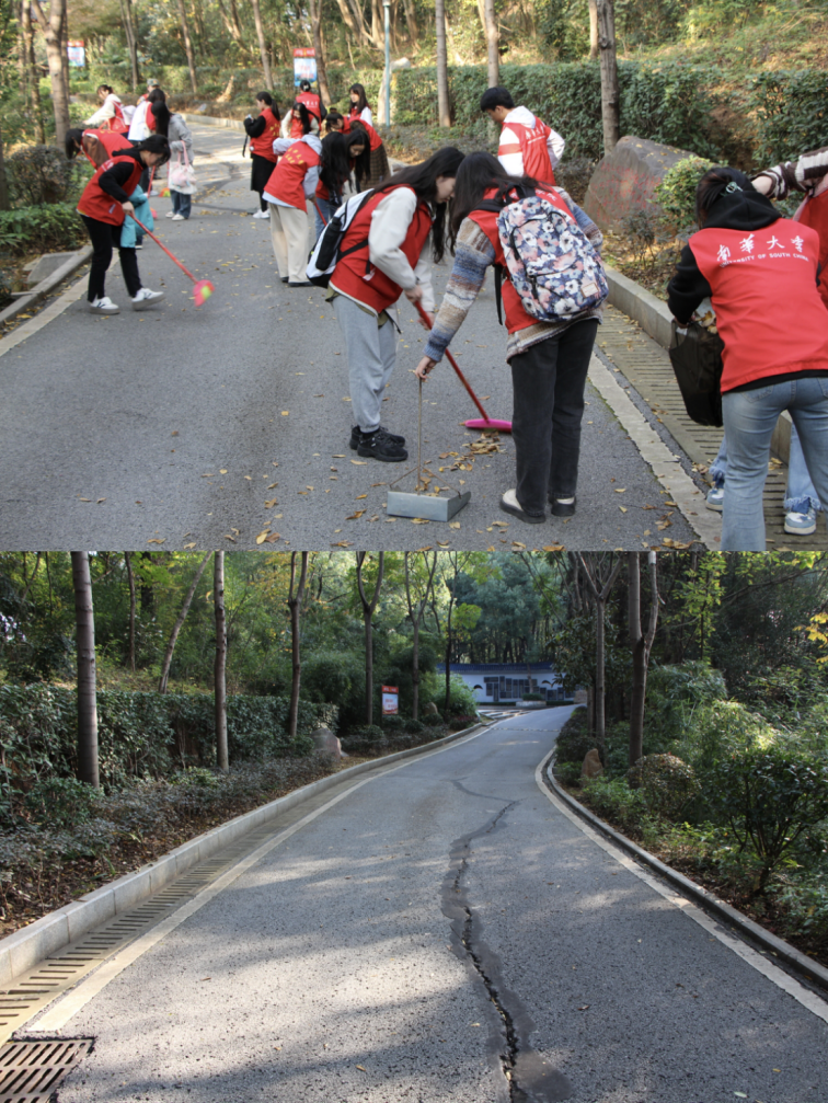 同学们在基地工作人员的引导下,参观了虎形山人防公园百部兵书道、百项防护知识区、百年空袭灾难警示墙、百将爱国诗林和百名衡阳军事人物风云录文化项目,聆听了工作人员的讲解,了解衡阳人防、国防建设的光辉历程,体会到人民军队的发展壮大,和平的来之不易。随后,在工作人员指导下,同学们拿起扫帚、撮箕等劳动工具,清扫落叶、捡拾白色垃圾,积极开展卫生打扫,经过一个下午的劳动,公园道路、草坪洁净如新。