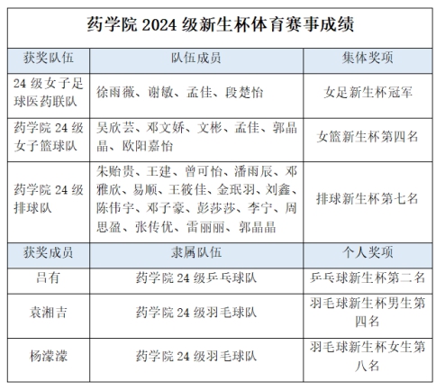 在个人项目中,24 级乒乓球队的吕有荣获乒乓球新生杯第二名;beats365vip官网登录入口 24 级羽毛球队的袁湘吉获得羽毛球新生杯男生第四名,杨濛濛获得羽毛球新生杯女生第八名。
